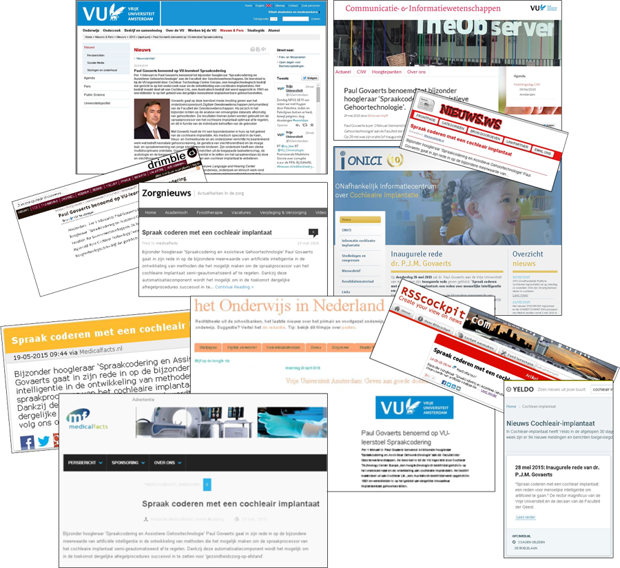 Prof. Govaerts benoemd tot Bijzonder Hoogleraar aan de VU Amsterdam: De benoeming van Prof Govaerts voor de nieuwe leerstoel "Spraakcodering en Assistieve Gehoortechnologie" krijgt ruime aandacht in de gespecialiseerde media.